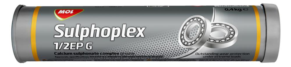 Mazivo MOL Sulphoplex 1/2EP G s komplexom sulfonátu vápenatého vyrobené z vysoko rafinovaných komponentov základového oleja s vysokou viskozitou, ktoré majú priaznivé odparovacie a oxidačné vlastnosti aj pri vysokých teplotách. Výrobok sa vyznačuje vynikajúcou odolnosťou proti opotrebovaniu, extrémnemu tlaku (EP) a odolnosťou voči vode. Vďaka vynikajúcej priľnavosti ku kovu a odolnosti voči vode je vhodný na mazanie miest vystavených vysokej dynamike vody. Je to primárne mazivo v priemysle, kde sú extrémne zaťažené ložiská v neustálom kontakte s vodou. Jednou zo špeciálnych vlastností maziva je, že jeho konzistencia a nosnosť sa pri vysokom množstve vody výrazne nemení. Je to stredne mäkké, čierne mazivo s 5 % obsahom grafitu. Teplotný rozsah použitia je od -15 °C do +160 °C. Špecifikácie a súhlasy: ISO 6743-9: L-XBEHB 1/2DIN 51502: KPF1/2P-15 Typické vlastnosti:Vzhľad čierny, homogénny