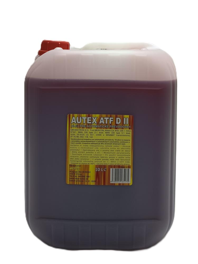 AUTEX ATF DII je kvapalina pre automatické prevodovky vyrobená z minerálnych základových olejov vyrobenýchprocesmi rafinácie ropy a obsahujú prísady, ktoré sú v súlade s prísnymi požiadavkami na kvalitu.Špecifikácie a súhlasy:MAN 339 Typ L2MAN 339 Typ V1